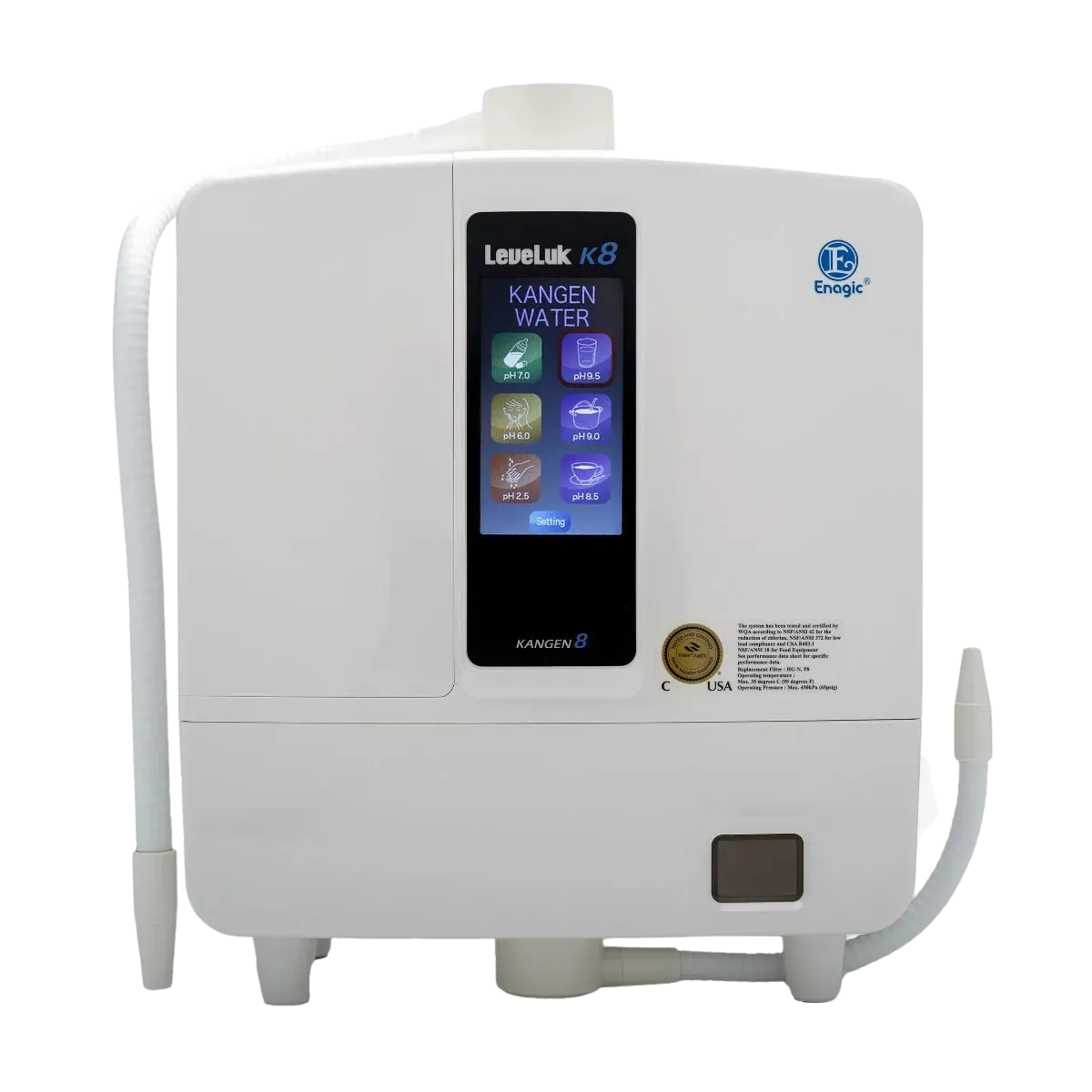 Model K8 to najbardziej zaawansowany system jonizacji wody w ofercie Enagic. Został zaprojektowany z myślą o maksymalnej wydajności, stabilności parametrów oraz komforcie użytkowania — zarówno w domu, jak i w małych firmach.