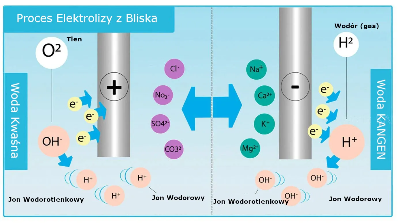 Po filtracji woda przepływa przez zestaw elektrod i membran, w wyniku czego dzieli się na wodę kwaśną i zasadową. Podczas tego procesu powstają jony wodorotlenkowe (OH⁻) i jony wodorowe (H⁺).